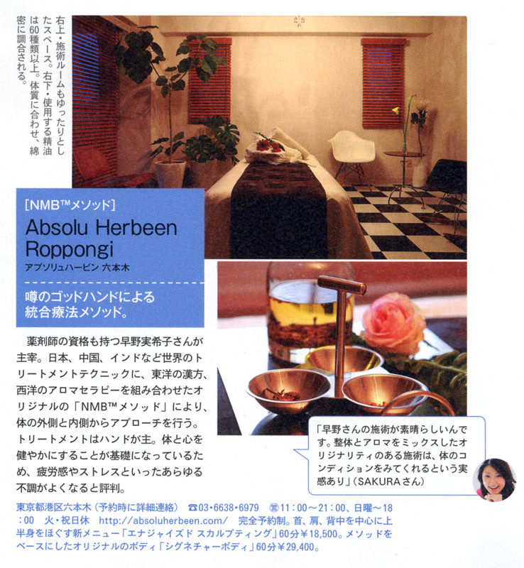 <あなたの疲れ、取り除きたい!極上スパ&セルフケアで今すぐ、自分メンテナンス。>の中で、モデル・ビューティジャーナリストのSAKURA様に当サロンをご紹介いただきました。薬剤師である早野実希子が考案した「NMB(TM)メソッド」を主体に、世界各国のトリートメントテクニックを融合した施術で心と体にアプローチするサロンとしてご紹介いただいております。是非ご覧ください。(P.85に掲載)