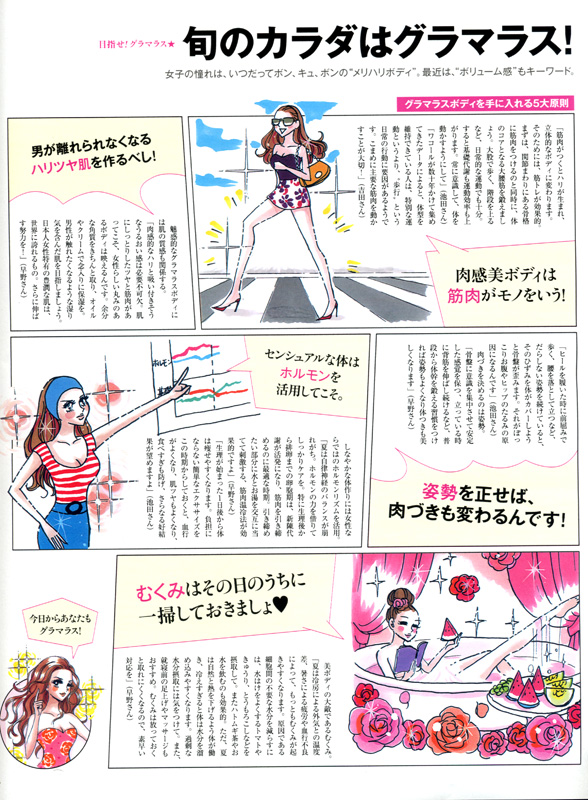 <目指せ!グラマラス★旬のカラダはグラマラス!メリハリUPの完全プログラム。>にて、早野実希子がメリハリ&グラマラスボディを手に入れる5大原則について述べさせていただきました。ハリツヤ肌の魅力、ホルモンリズムを活用したボディメイク、体つきを変化させる姿勢キープ法などについてアドバイスさせていただいております。是非ご覧ください。