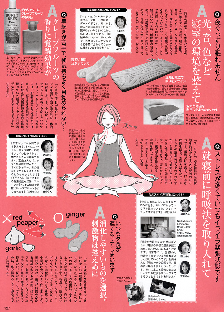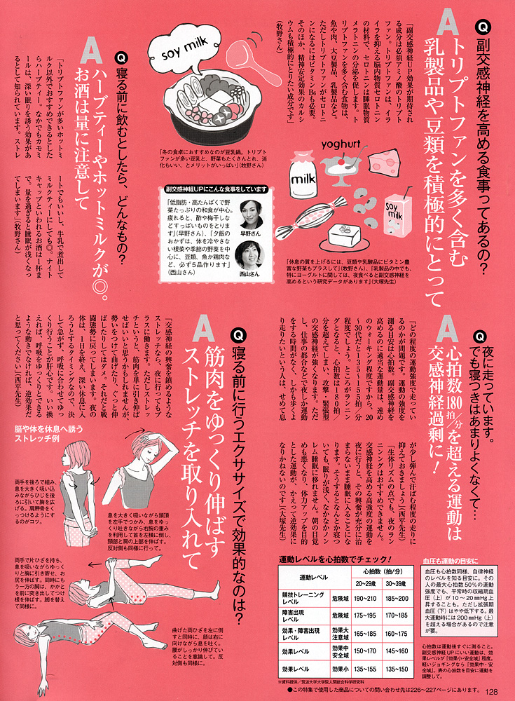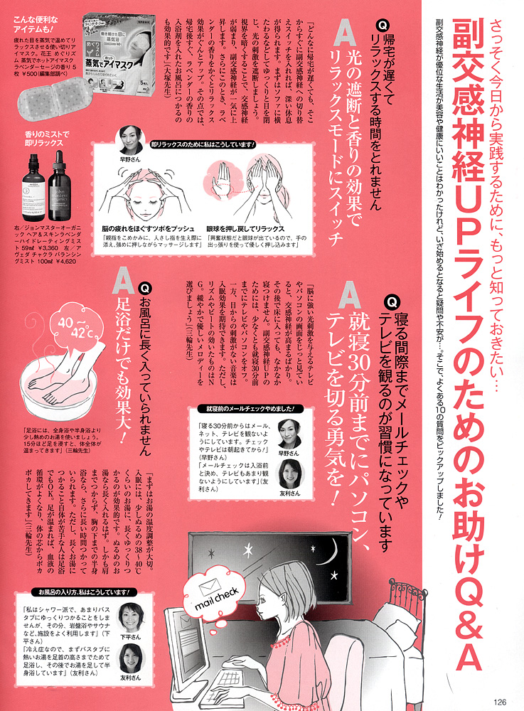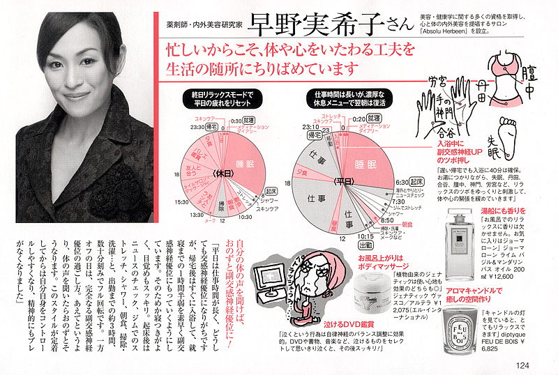 <キレイを作る「副交感神経」をUPせよ!〜美賢者5人の副交感神経優位ライフをのぞき見!〜>の中で、早野実希子の平日ライフと休日ライフのご紹介、および、副交感神経UPライフのためのQ&Aに回答させていただきました。 早野独自の様々なアイディアが満載です。是非ご覧ください。 (P.124、P.126〜P.128に掲載)