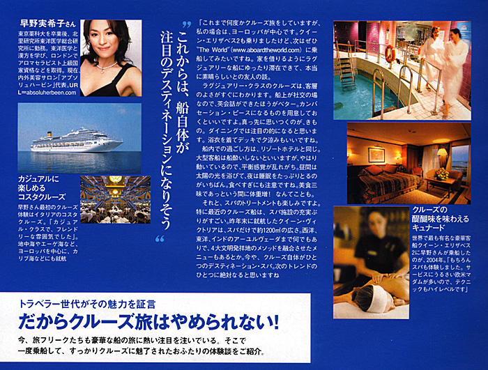 『特に最近のクルーズ船は、スパ施設の充実ぶりがすごい。広さやトリートメントメニューの種類も充実しています。これからは、クルーズ自体がひとつのデスティネーション・スパになりそうです!』などのコメントと共に、船内での過ごし方や、注目するクルーズのスパのトリートメントなどについてお話させていただきました。