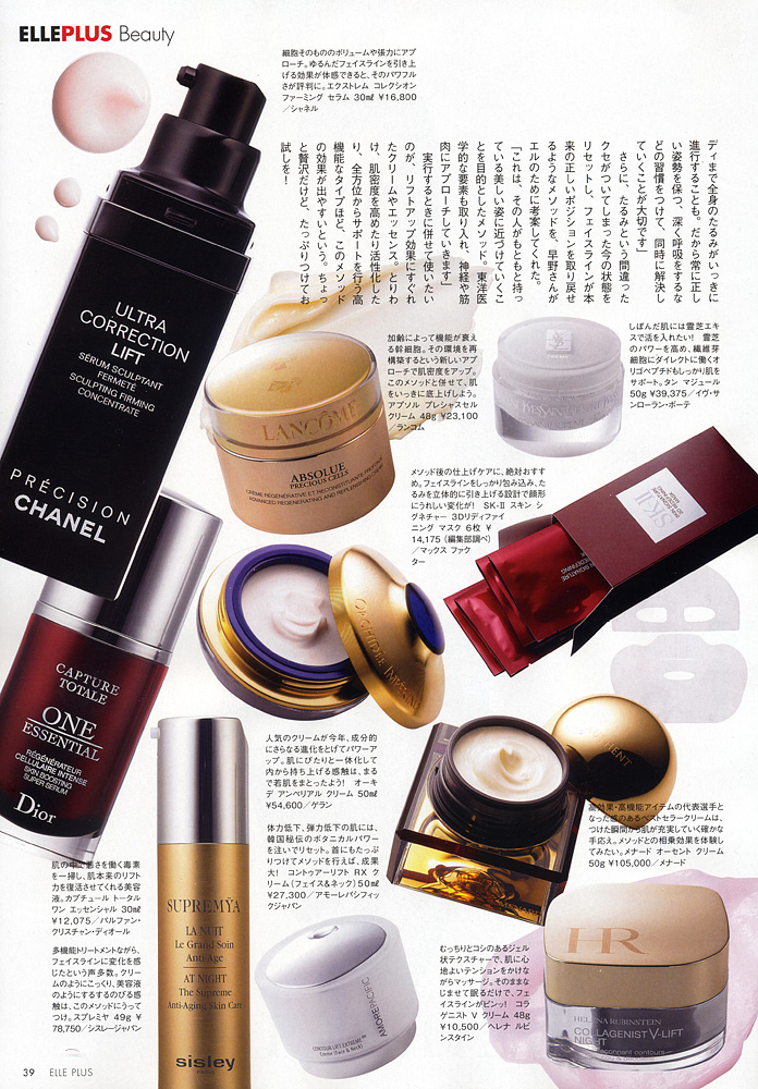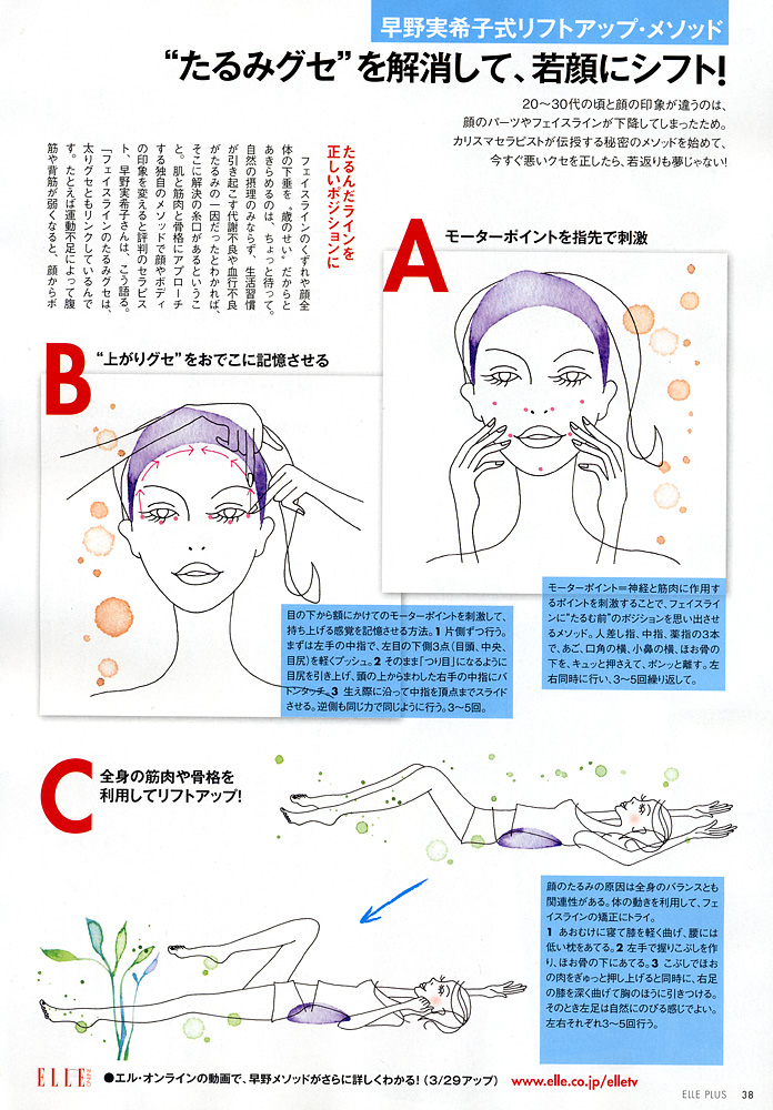 インターネットwebsite「ELLE ONLINE」の“ELLE TV”との連動企画として、雑誌ELLEの別冊付録エル・プリュスに早野実希子式リフトアップ・メソッドを掲載いただきました。「“たるみグセ”を解消して、若顔にシフト!」と題しまして、年齢と共に下降した顔のパーツやフェイスラインを正しいポジションにリフトアップする秘密のメソッドをご紹介しております。東洋医学的な要素も取り入れ、神経や筋肉にアプローチしていく早野独自のメソッドです。“ELLE TV”と共に、是非ご覧ください。