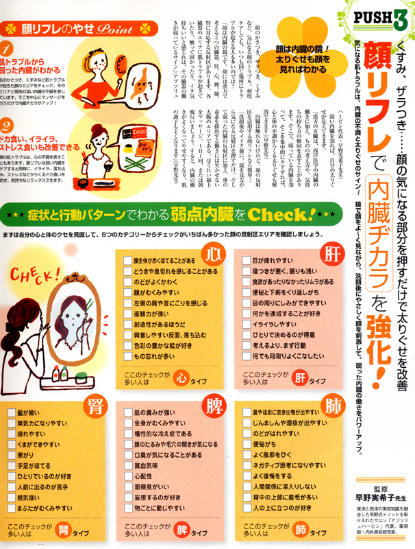 お顔のかさつきや、ザラつき、くすみなど、気になる悩みが、いつも同じ場所に起きることはありませんか?実は、お顔には内臓の反射区があり、肌のトラブルは、その時の身体の状態のサイン。症状と行動パターンから、弱った内臓をみつけ、弱点になっている内臓の反射区を刺激する「顔リフレ」を早野実希子が紹介させていただきました。気になる症状と、それぞれの内臓に対応した反射区の解説をさせていただきました。洗顔後、メイク前の簡単な「顔リフレ」で内臓を活性!太りぐせ克服にお役立てください。
