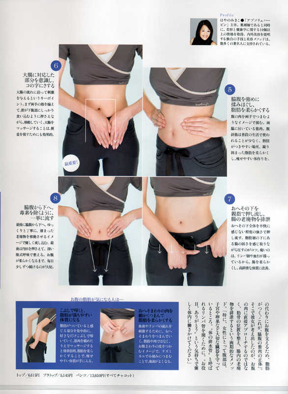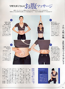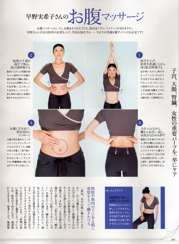 <2009年保存版“美のサプリメント”45歳からのセルフマッサージBOOK>の中で「お腹マッサージ」について早野実希子のメソッドが紹介されました。肋骨の位置を上げ、丹田を強化し、腸内の老廃物を排出する - 今までの常識を覆すメソッドの数々をご紹介しています。子宮、大腸、腎臓。女性の重要なパーツを一挙にケアする画期的なメソッドです。是非ご参考になさってください。 (P.348〜P.349に掲載)