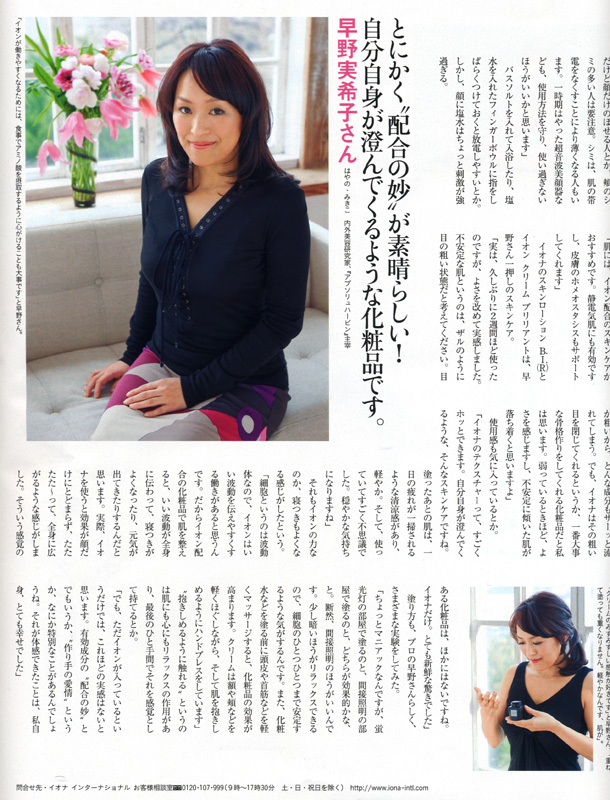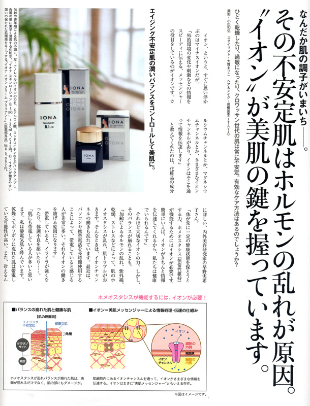<なんだか肌の調子がいまいち—。その不安定肌はホルモンの乱れが原因。“イオン”が美肌の鍵を握っています。>において、イオンと肌の関係やイオンの持つ働きについて早野実希子が述べさせていただきました。加齢、ホルモンバランスの乱れ、ストレスなど様々な要因で機能が低下しやすい肌に対し、イオンがいかに働きホメオスタシス(恒常性)が機能するのか、そして、イオンの持つ肌への有効性等について分析させていただきました。是非ご覧ください。