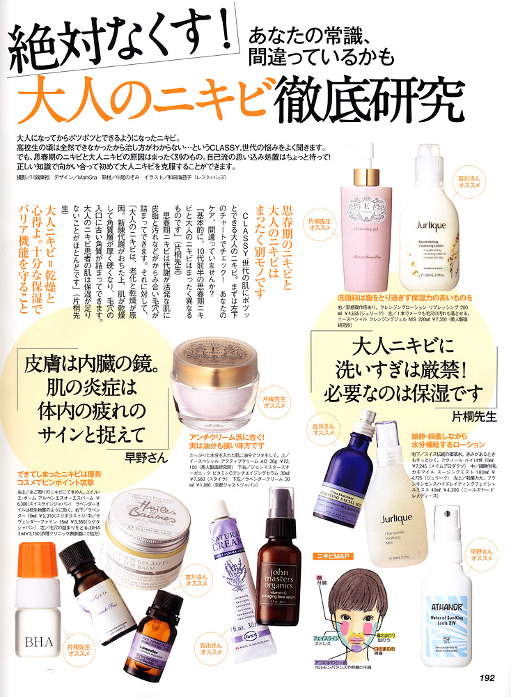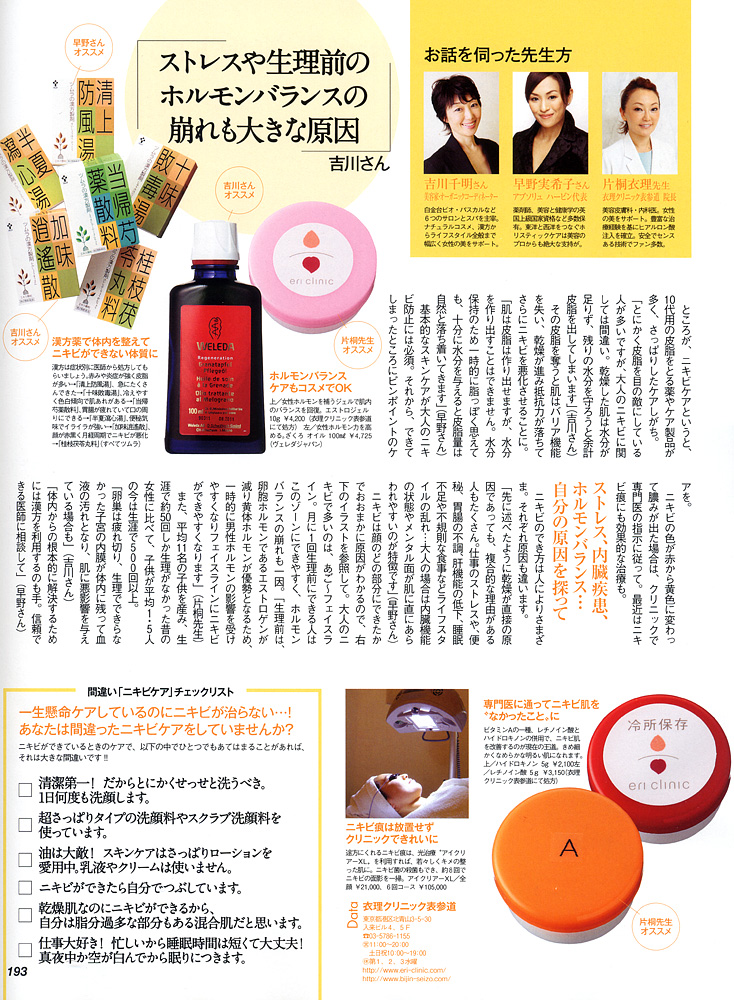<絶対なくす!大人のニキビ徹底研究>にて、早野実希子が、大人ニキビの原因や特徴およびその対処法等について、東洋医学そして内外美容の観点からお話させていただきました。 是非ご参考になさってください。 (P.192〜P.193に掲載)