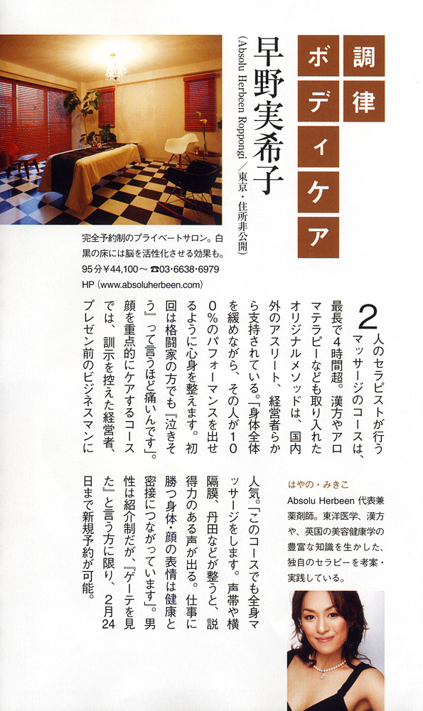 GOETHE 2010年3月号 <「24時間仕事バカ!」はカラダがシホン![総力特集]あの人はもうやっている。カラダの最先端メンテナンス術> にて、「ゲーテ厳選の個性派メンテナンスマスター」として、早野実希子およびアプソリュハービンをご紹介いただきました。 男性に人気のコースについて、早野のコメントも掲載いただいております。是非ご覧ください。 (P.78に掲載)