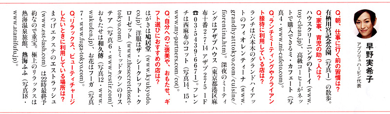 <サクセスウーマンの24時間お役立ちアドレス>にて、早野実希子のお気に入りの場所や御用達レストラン、ギフト選びやおもたせにおすすめのお店などをご紹介させていただきました。是非ご覧ください。(P.34に掲載)