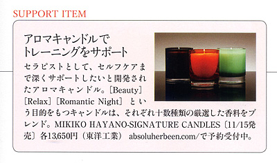 婦人画報2010年12月号<アロマキャンドルでトレーニングをサポート>にて、早野実希子がプロデュースしたアロマキャンドル『MIKIKO HAYANO SIGNATURE CANDLES』をご紹介いただきました。3つのシーン「Beauty」「Relax」「Romantic Night」をテーマに、それぞれのキャンドルには、世界中から厳選した十数種類の香料を配合。11月15日発売予定で、ただいまご予約受付中です。詳しくは、こちらをご参照ください。