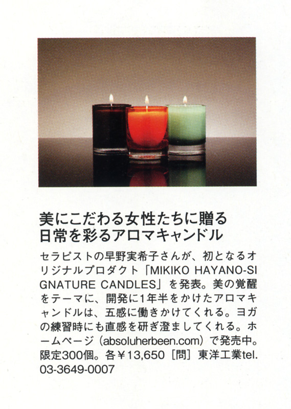<Yoga Journal Finds ~ヨガライフに役立つ情報をピックアップ~>にて、「MIKIKO HAYANO SIGNATURE CANDLES」をご紹介いただきました。ヨガの練習時にも直感を研ぎ澄ませるキャンドルとして掲載いただいております。是非ご覧ください。(P.144)