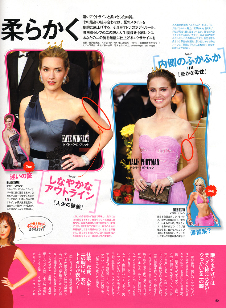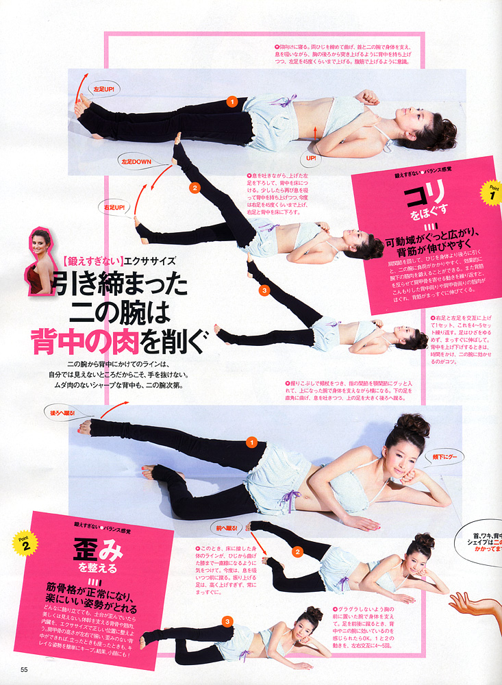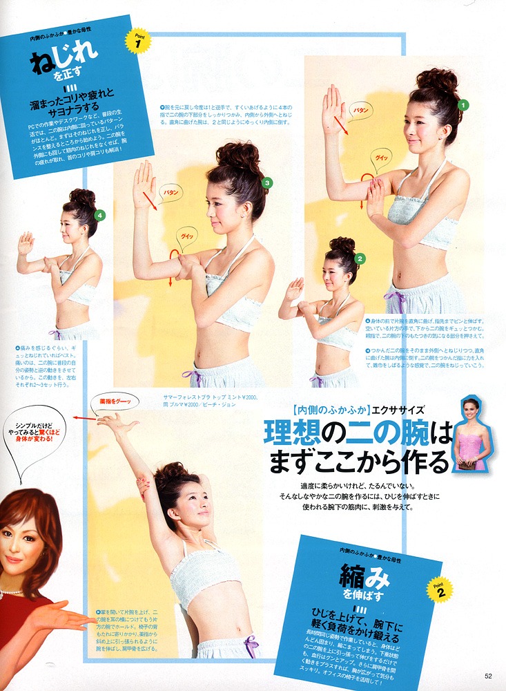 <二の腕は、潔く、柔らかく>にて、早野実希子が、理想の二の腕エクササイズを監修させていただきました。鍛えるだけでは美しく引き締まらない二の腕について、ねじれを正す、縮みを伸ばす、コリをほぐす、詰まりを流す、埋もれをなくす、たるみを削ぐ、すくみを開く、歪みを整える、それぞれのエクササイズをご紹介しております。二の腕にお悩みの方に是非行っていただきたいエクササイズです。ご参考になさってください。