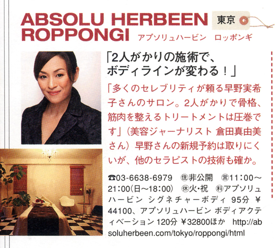 <日本全国のゴッドハンド100人>にて、アプソリュハービンを掲載いただきました。「多くのセレブリティが頼る早野実希子さんのサロン。2人がかりで骨格、筋肉を整えるトリートメントは圧巻です。」と美容ジャーナリストの倉田真由美様よりご紹介いただいております。是非ご覧ください。(「ゆがみ系」のページに掲載)