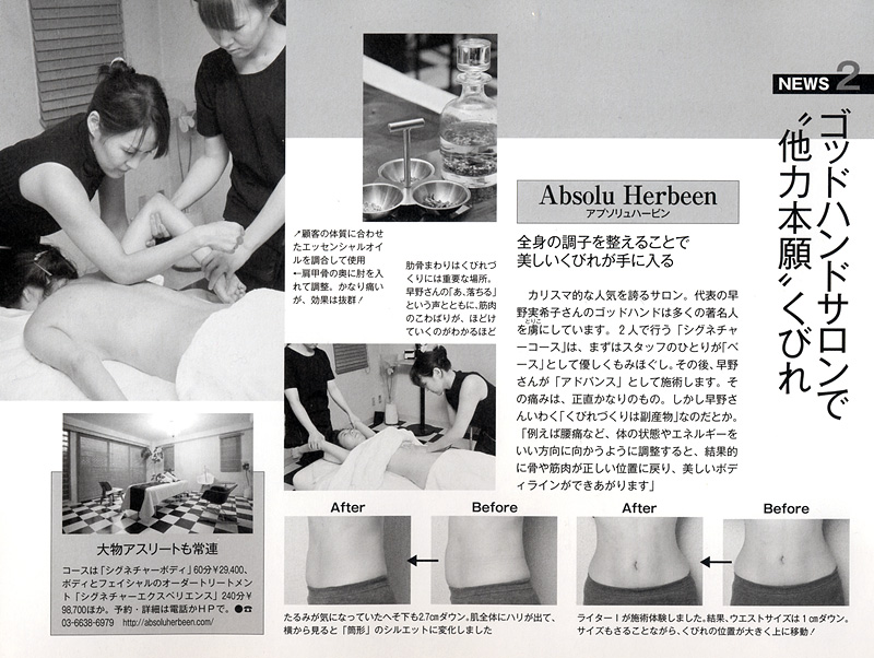 <ウエストラインが変われば人生変わる!「くびれ」は女のたしなみです>の中で、『ゴッドハンドサロンで“他力本願くびれ”』と題して「Absolu Herbeen」をご紹介いただきました。当サロンの代表メニューである“シグネチャーコース”で美しいくびれをお作りした際の「before」、「after」を掲載させていただいております。美しいくびれ作りに関する早野実希子のコメントも掲載させていただいております。