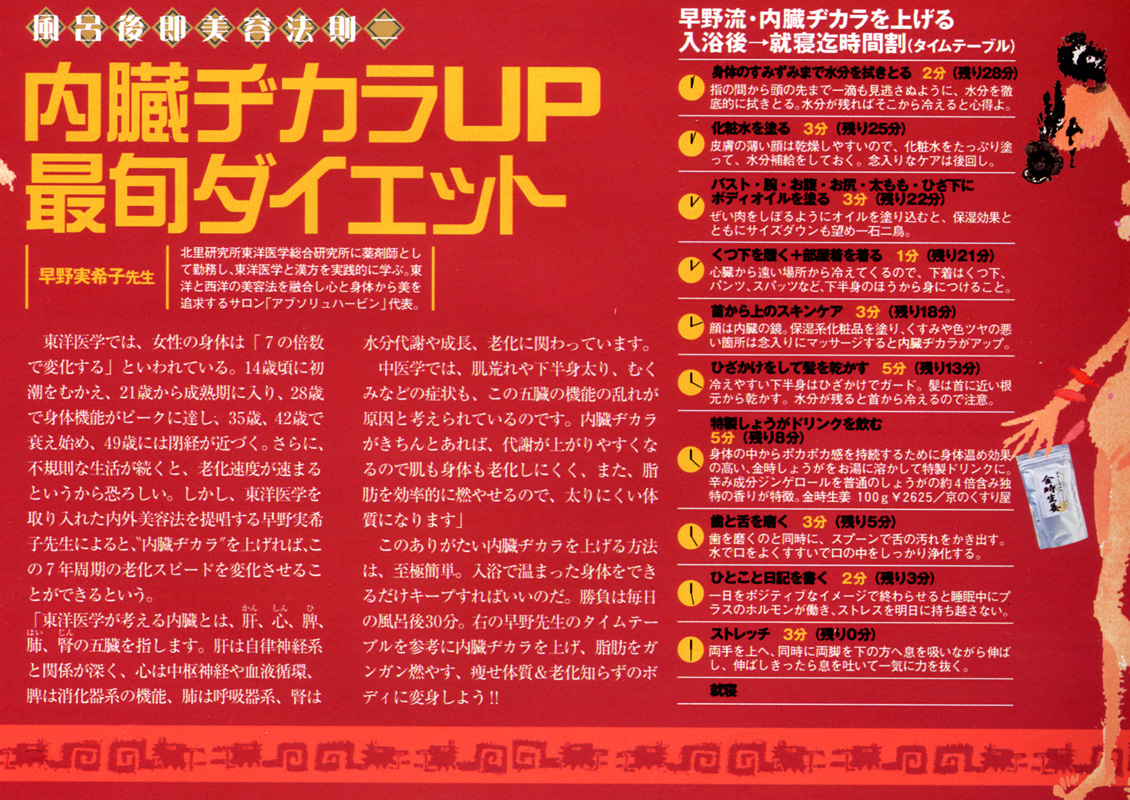 風呂後即美容法則「内臓ヂカラUP最旬ダイエット」をテーマに、東洋医学に精通した薬剤師・早野がご紹介するのは、内臓ヂカラを上げる「入浴後→就寝迄時間割」です。入浴後から就寝までの30分間、東洋医学的視点から早野が考案したとても簡単な方法を実践するだけで、痩せ体質&老化知らずのボディを手に入れることができるのです!是非今日から始めてみませんか?(P.227に掲載)