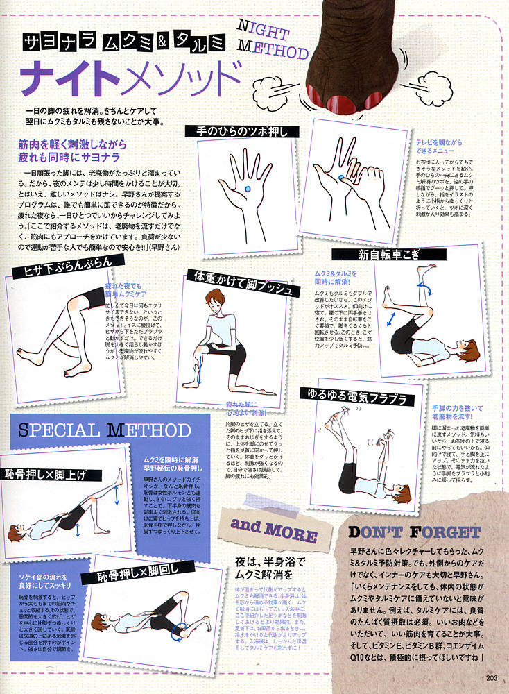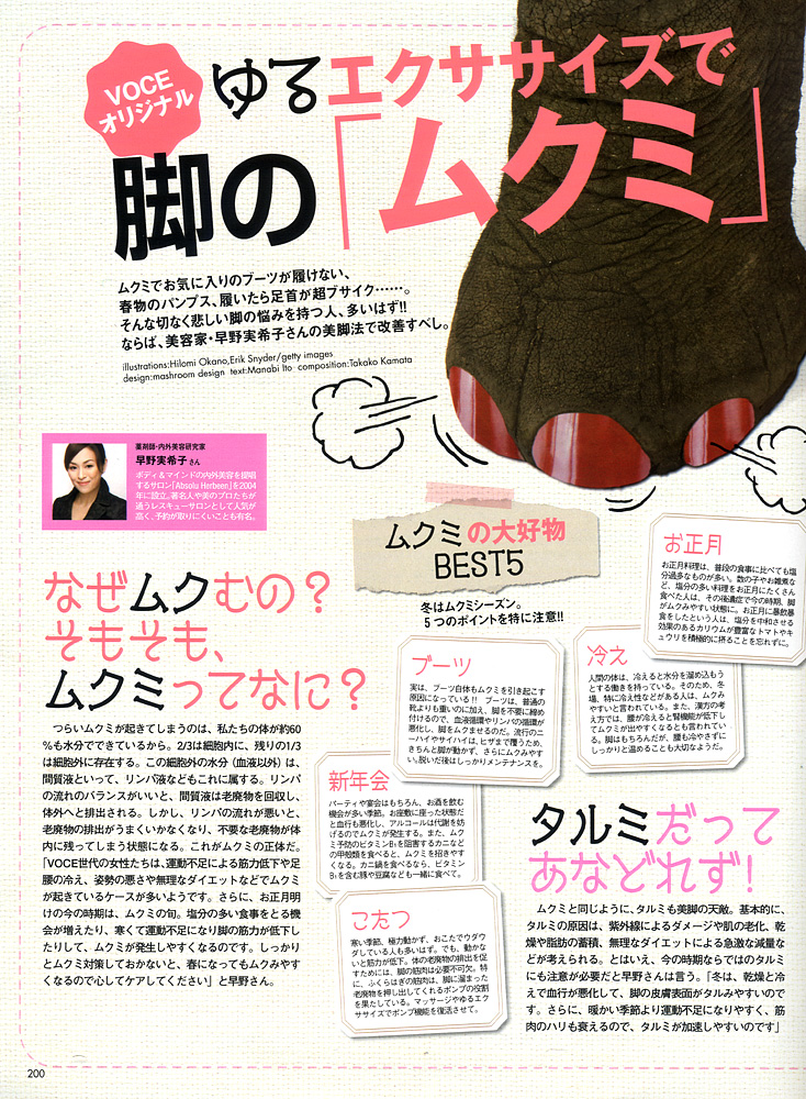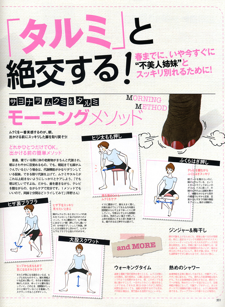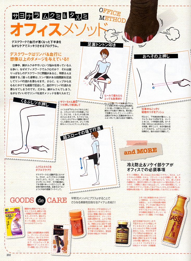 <VoCE 2010年3月号 ゆるエクササイズで脚の「ムクミ」「タルミ」と絶交する!>にて早野実希子が美脚法をレクチャーさせていただきました。 モーニングメソッド、オフィスメソッド、ナイトメソッド、とシーン別にムクミ解消に効果的なアイテムやマッサージ、エクササイズ等をご紹介しております。 是非ご参考になさってください。