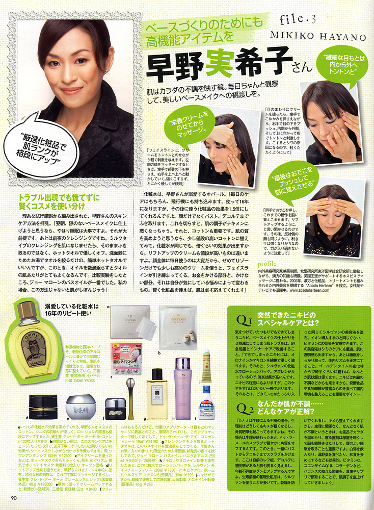 <仕上がりを変えるスキンケアの「技あり」!美界人たちが欠かさない“ひと手間”教えます>にて、早野実希子の愛用化粧品やスキンケアの際に行っているフェイスマッサージをご紹介させていただきました。また、突然できたニキビや肌の不調に対するスキンケア方法についてもお話させていただいております。是非ご覧ください。(P.90に掲載)