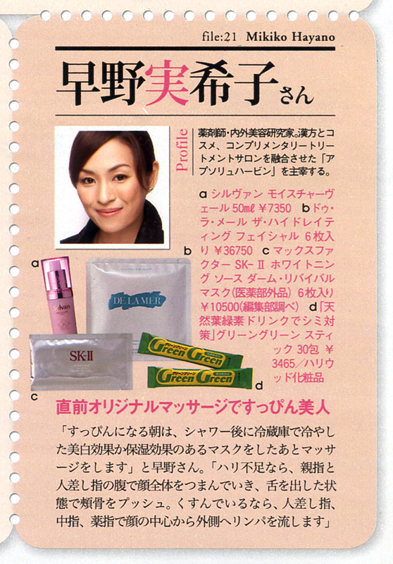 <美人底上げ!すっぴんビューティ~こっそり公開!内緒の“裏ワザ&隠しワザ”>にて早野実希子の愛用アイテム及びすっぴんになる朝に効果的なスキンケア&マッサージ法をご紹介させていただきました。是非ご覧ください。(P.102に掲載)